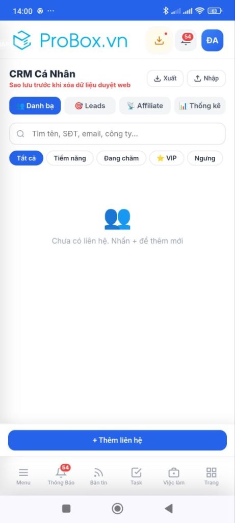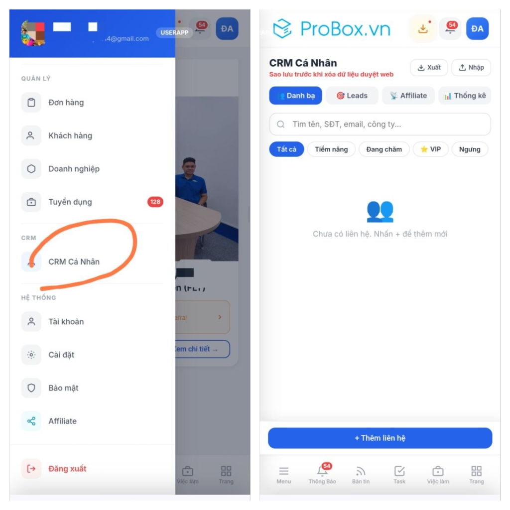 Trong bối cảnh người dùng ngày càng quan tâm đến việc kiểm soát dữ liệu cá nhân và tối ưu hiệu quả công việc, nền tảng ProBox.vn đã chính thức giới thiệu tính năng CRM Cá Nhân – một công cụ giúp mỗi người dùng có thể tự quản lý danh bạ, khách hàng và cơ hội kinh doanh ngay trên điện thoại của mình.