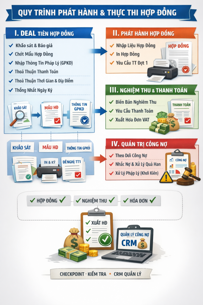 - Deal → Hợp đồng → Nghiệm thu → Công nợ